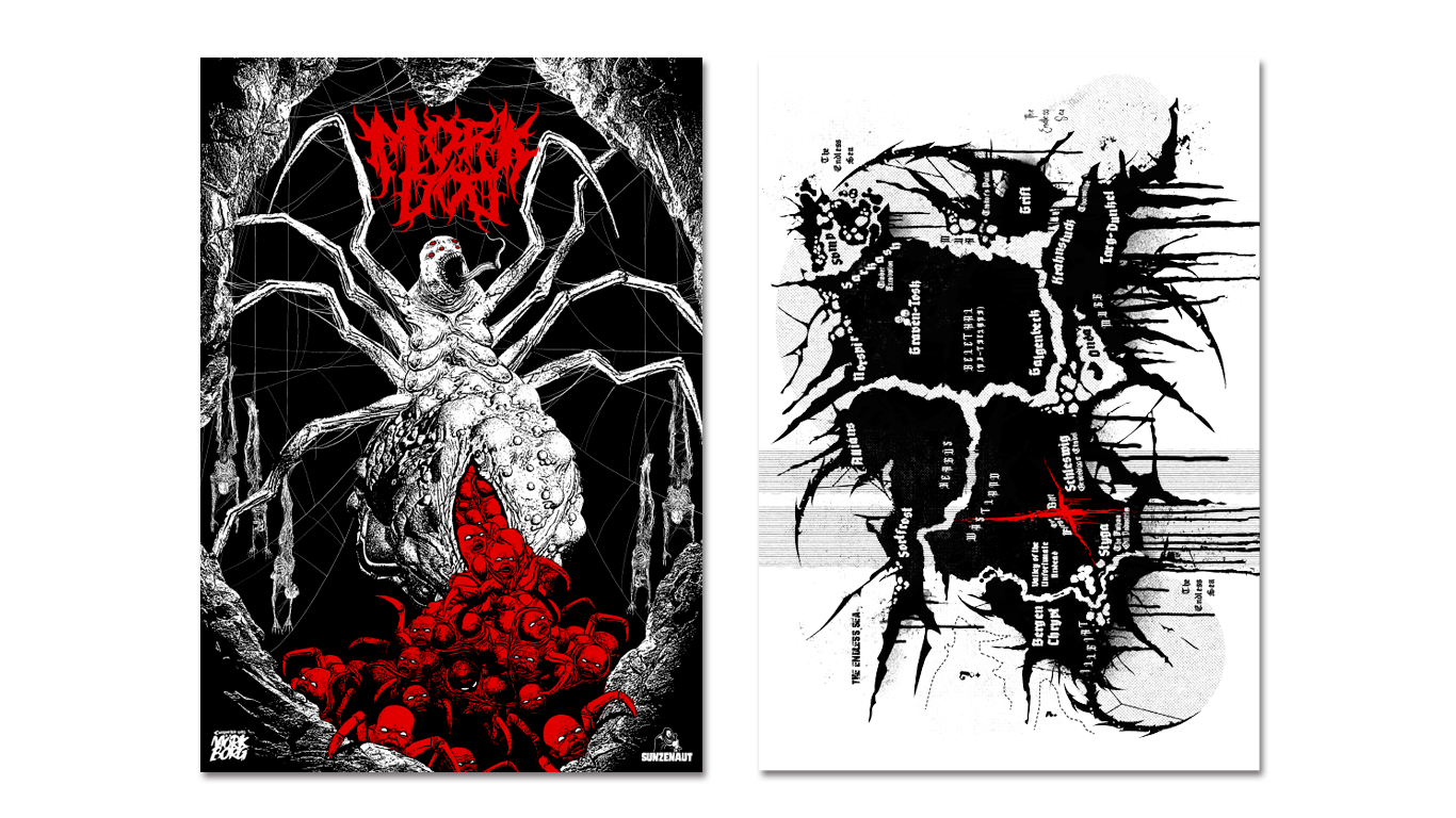 MÖRK DÖD poster with artwork on one side and the world map on the other.